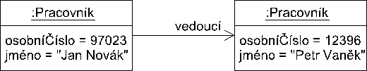 V každém spojení mohou propojené objekty zastávat určité role. Například ve spojení dvou osob může jedna z nich zastávat roli zaměstnance, druhá roli zaměstnavatele. Názvy rolí můžeme uvést nad příslušným koncem spojení - viz Obr. 1.3. Grafické znázornění objektů a jejich vztahů v určitém čase se nazývá objektový diagram a je jedním z prostředků, jak můžeme vyjádřit výsledky analýzy a návrhu části systému. Představuje vlastně ukázku konkrétní situace, která může za běhu systému nastat.